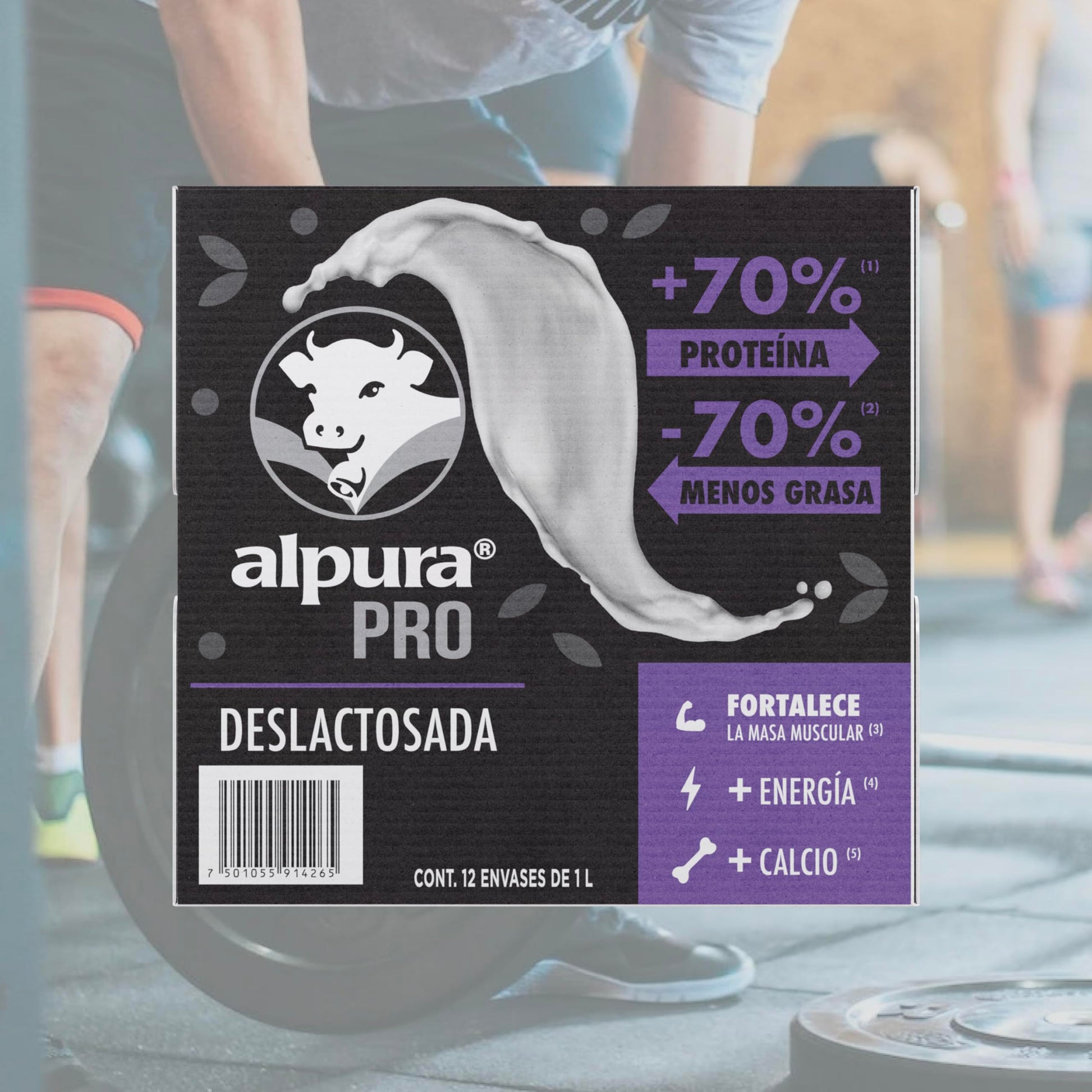 Alpura Pro con extra proteína Deslactosada Ultrapasteurizada en Paquete de 12 piezas de 1 Litro cada una, Fuente de proteína y Calcio, baja en grasa, adicionada con Vitaminas A y D