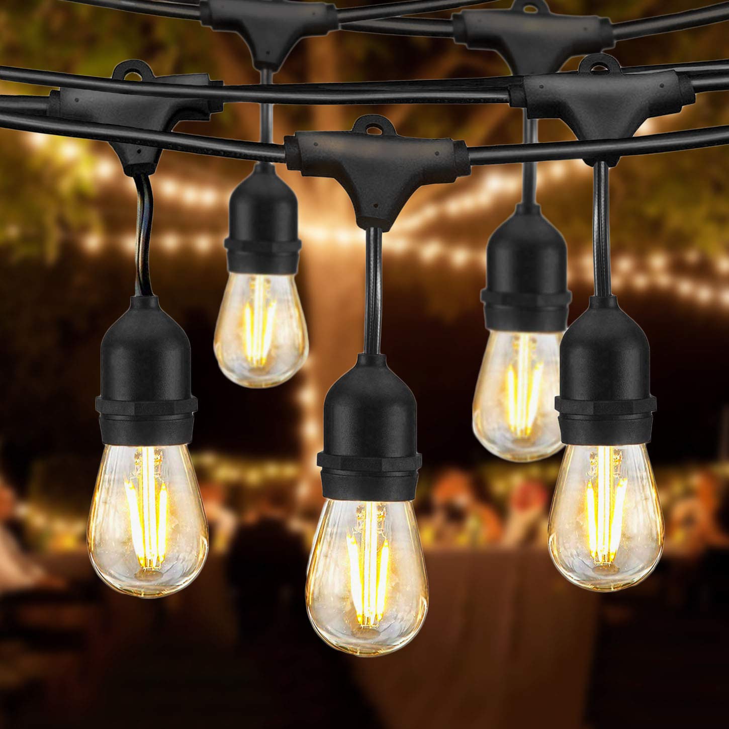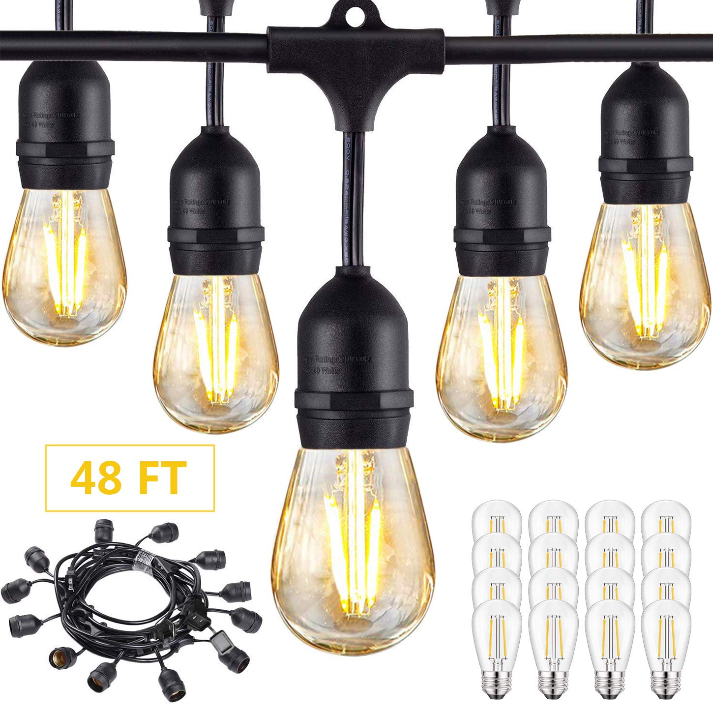 BRIGHTSHOW - Techo 48FT LED Luces de cadena al aire libre Impermeable Regulable 15PCS 2W Vintage Edison Bulbos de vidrio