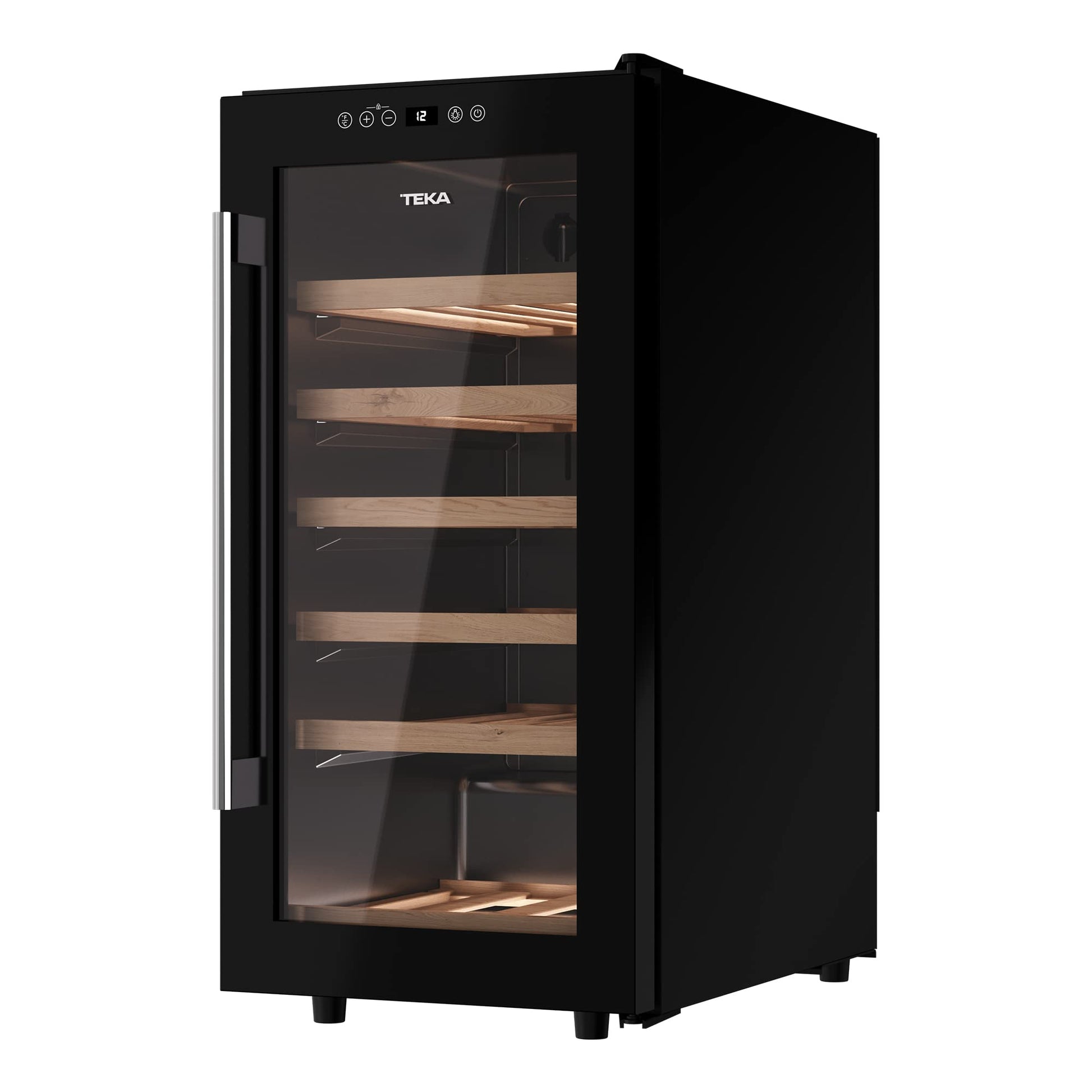 Enfriador de Vinos TEKA marca Alemana modelo RVF 10032 GBK.Libre instalación.Acero inoxidable.Capacidad 83Litros/32botellas.Puerta cristal negro.5 anaqueles de madera.Ilimunación LED.nivel sonor 42DB.