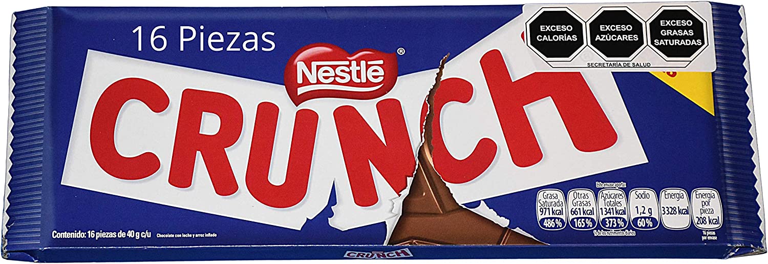 PAQUETE DE 16 PIEZAS. Por más de 28 años el chocolate Crunch ha acompañado a los jóvenes en México; cada barra de 40 g es una combinación ruidosa y crujiente de chocolate con leche y arroz inflado que puede ser disfrutada en cualquier lugar y a cualquier hora del día. Vive una crujiente experiencia que sólo el ruido de Crunch te puede dar. Inicia tu día con la siguiente receta que tenemos para ti: Ingredientes: - 2 Cucharadas de Azúcar - 1/2 Taza de Leche Evaporada Carnation Clavel - 1 Cucharada de esencia de vainilla - 2 Sobres de Nescafé Capuccino Original - 3 Barras de Chocolate Crunch troceado - 1 1/2 Taza Hielo frappé Instrucciones: 1. Licúa la Leche Evaporada Carnation Clavel con el azúcar, la esencia de vainilla, la mezcla en Polvo para Preparar Café Nescafé Cappuccino Original y el hielo. 2. Agrega las barras de Chocolate con Leche y Arroz Inflado Crunch a la mezcla anterior. 3. Vierte en un vaso y ¡Disfruta!