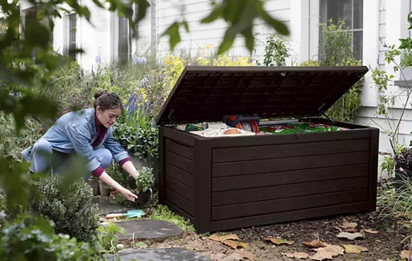 Keter - Keter Caja de almacenamiento de cubierta de resina resistente a la intemperie de 165 galones para exteriores, muebles de jardín, color café