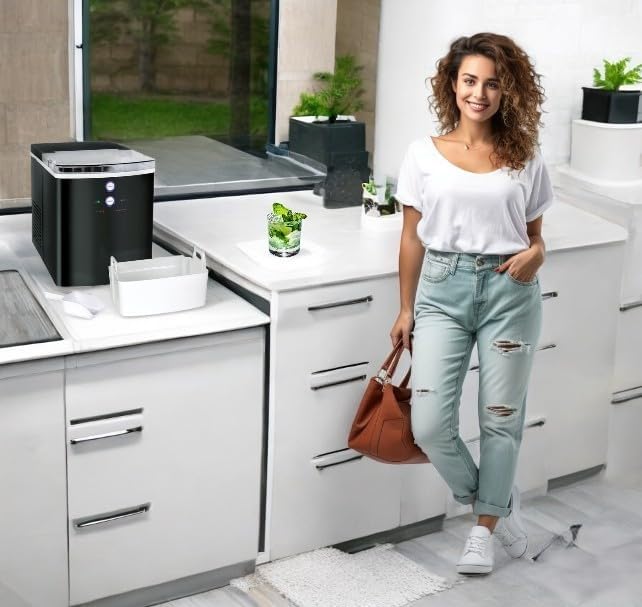 RIVARRO Máquina de Hielo, Fabrica 9 Cubos de Hielo cada 6-8 minutos, 14 Kg en 24 horas, 2 Tamaños de Hielo, con Cesta y Pala, Acero Inoxidable, Color Plata