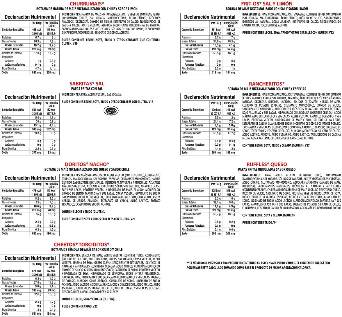 ¡Llegó el paquete surtido de 55 piezas: Sabrimayoreo! ¡Contiene una variedad de nuestras marcas más amadas en su versión mini: Sabritas Sal, Doritos Nacho, Ruffles Queso , Cheetos Torciditos, Fritos Sal, Churrumais y Rancheritos! Es el paquete ideal para completar las opciones de botanas para cualquier evento, ya que puedes combinarlos con tus ingredientes favoritos y darles un giro con los sabores que te gustan y, así, compartirlos con todos tus amigos ya que a todos les encantarán. Disfruta esos momentos divertidos entre los chicos y los más grandes. ¡Y todo a un precio accesible! Saca la cuenta y obtén 5 piezas más.