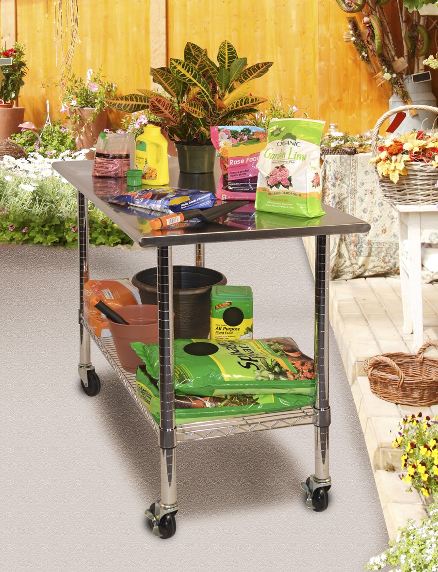 Heavy duty work table with 1,000 lb. load capacity. Durable stainless steel work top has 1-1/2" radius edges. Four 1-1/2" diameter chrome leg posts. One chrome wire shelf can be adjusted in 1" increments. Four 4" swivel casters, 2 have locking brakes. NSF Approved. Easy to assemble in minutes.